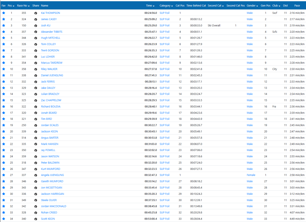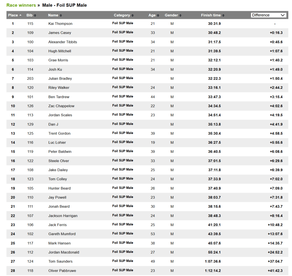 An awesome afternoon of foil racing for the 2024 West Coast Downwinder. The seabreeze filled in early and we had a good 20 knots of wind along the race course. Stand-out performances from local boy Andrew Bell who managed to keep pace with the professional foilers on a Code 850S, closely followed by another West Aussie local Hugh “The Foil Project” Mitchell. Most notable performances were the father and son duo of Kurt and Gareth Mumford hailing from Esperance, WA. Kurt won the prize for youngest competitor in the field at the age of 15 will no doubt be chasing the lead pack in the years to come. The international YouTube sensation Jason “Downwind Drifter” Watson graced us with his Jesus like presence floating on water along with his band of Kiwi mates in Scott and Jackson Keon and Jon McGettigan. Hopefully we will see more Kiwi’s take the journey over the ditch and head to West Oz for racing in 2025. The longest travelled International racer went to Richard Boudia from France who managed a respectable 16th place slightly handicapped by his limited equipment choice as he was missing his small race foils. The Ladies fleet had three local entrants all from Western Australia. A very close battle fought at the front between Code Foil riders Krystal Cotterill and Angela Juengling finishing withing minutes of each other. Taking a very respectable third place was Aya Okano riding an OG Art999, hopefully MrAxis can hook Aya up with a Hot New Fireball to get her up to speed with the front runners! There was a long list of fresh racers the Perth East Coast of Australia for whom the West Coast Downwinder was their first long distance foil race. Well done to all for making it to the start line and signing up. Hopefully in 2025 we can see over 100 people enter the WA Race Week foil division.