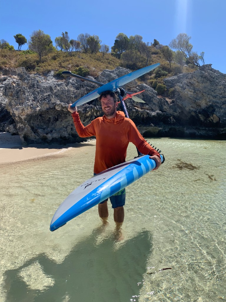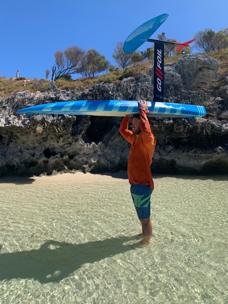 In beach shore breaks or surf zones the on the head carry technique can work well. This allow you to get out to foil depth before flipping the board over. Point direct into the waves or wind and act fast. Take care using this technique in high winds as you can lose your grip when hands are wet.